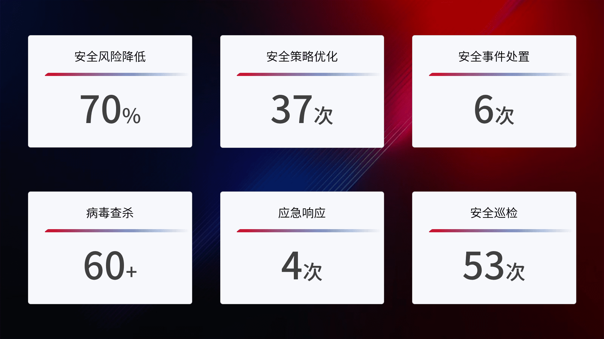 提供全面的安全事件报告体系,,,,包括处置报告、、、周报、、、、季度和年度总结,,,结合持续监控,,,帮助客户深入了解网络安全状况。。。。