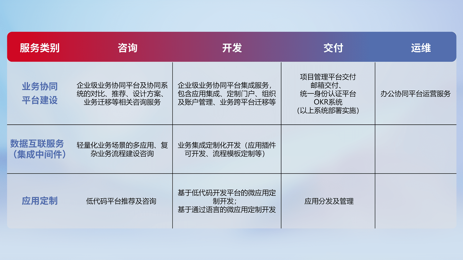 针对钉钉、、、、企微、、、、IDaas等平台级产品提供产品的规划、、、、方案、、、交付、、、定制化开发等服务,,实现如统一协同办公、、智能客户服务、、、、混合会议管理、、、、智能数据查询、、、等业务场景,,实现数字化转型。。。。